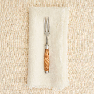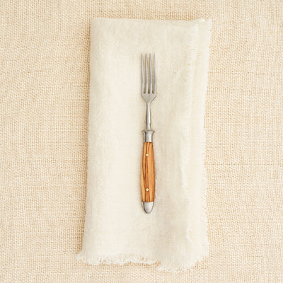 This Eichenlaub cutlery collection is hand-forged from one piece of stainless forging steel, ground by hand, and finely finished by experienced artisans with handles of olive wood, which has a smooth, silky surface and a beautiful, pale grain. Olive wood is hard, dense and durable, making it ideal for kitchenware, and it deepens with depth of color with age. Eichenlaub cutlery, founded in Solingen, Germany, in 1910, is crafted in 122 steps of production for each hand worked piece. Signature double metal bolsters at the bottom and top of the handle provide stability and create an elegant, balanced design. Handles are exceptionally riveted and polished. The long tines of each fork are meticulously tapered all around, ensuring that they will remain sharp. Exclusively at RW Guild in the United States.